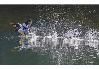 2025.11.24 11:23 호사비오리 수컷이 북한강 상류에서 수면을 박차며 날아오르고 있다. 매년 가을이면 한강 상류, 강원도 춘천 의암댐에서 강촌까지의 구간에는 세계적으로 희귀한 손님이 모습을 ...