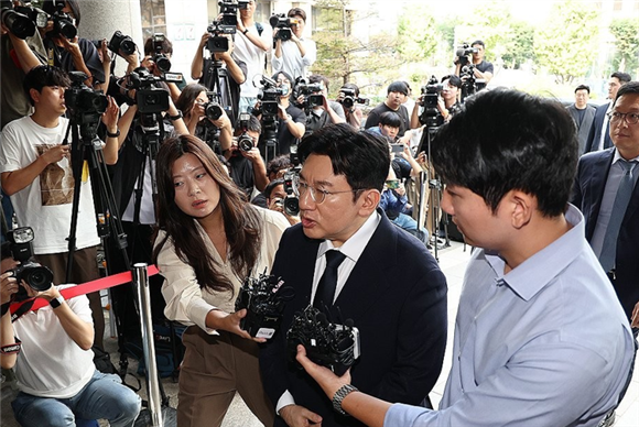 방시혁 하이브 의장이 15일 서울 마포구 서울경찰청 금융범죄수사대에 피의자 신분으로 출석했다. (사진=연합뉴스)