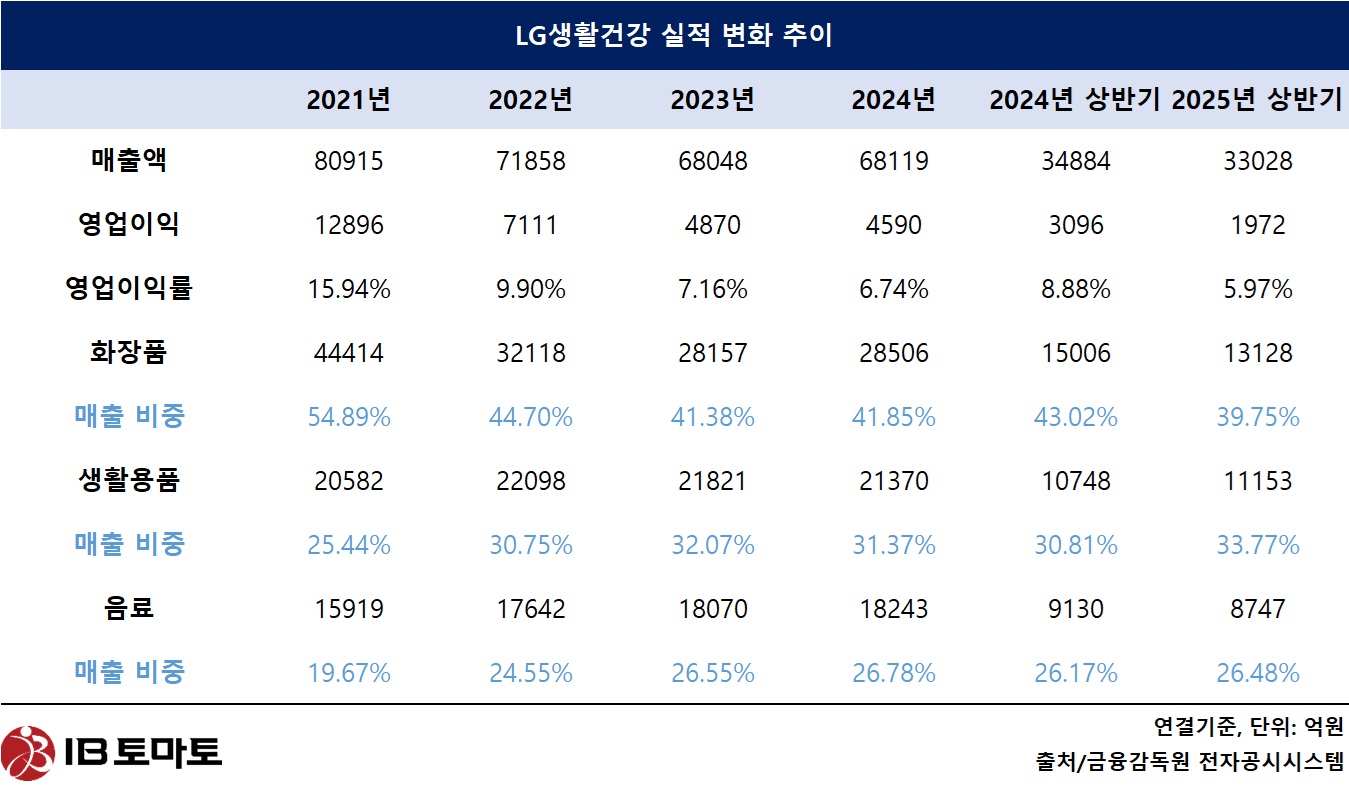 2일 금융감독원 전자공시시스템에 따르면 LG생활건강은 올해 상반기 매출액 3조3028억원으로 지난해 반기(3조4884억원) 대비 5.32% 감소했다. 앞서 LG생활건강은 지난 2021년 매출 8조원으로 최대치를 기록한 이후 중국 내 코로나19 재확산으로 인한 소비 감소와 자국 제품 소비 경향이 확대되면서 매년 역성장세가 이어지고 있다.