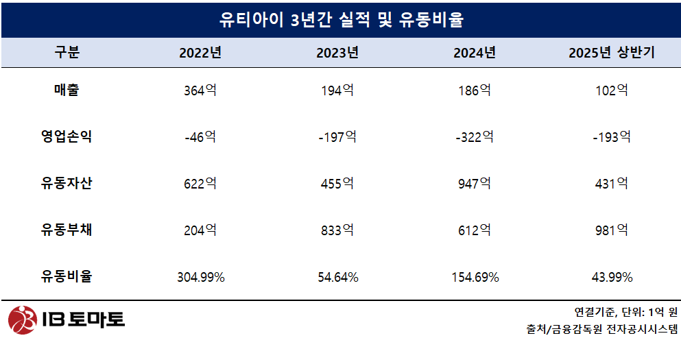 아울러 아직 폴더블폰 양산 시점은 2026년까지 남아 있는 가운데 유티아이는 재무 건전성이 악화돼 있어 버티기에 나서야 할 것으로 보인다. 유티아이는 2021년부터 4년 연속 적자 지속으로 한계기업에 처해 있다. 현금 창출력과 유동성은 크게 떨어져 있어 이번 교환사채 이후에도 자금 조달 필요성이 지속될 것으로 보인다.