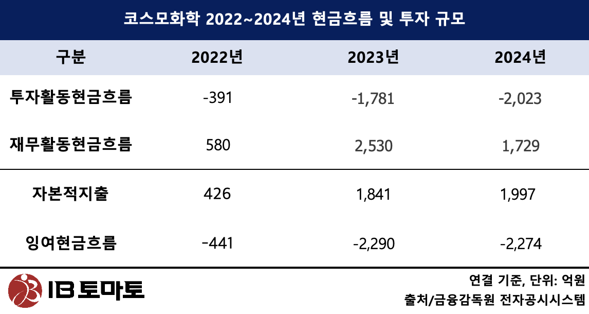 코스모화학은 부족한 투자 자금을 조달하기 위해 외부 차입에 의존하는 모습을 보이고 있다. 2023년 재무활동현금흐름은 2530억원, 지난해에도 1729억원에 달했다. 이에 따라 차입금 부담이 크게 늘어났다.