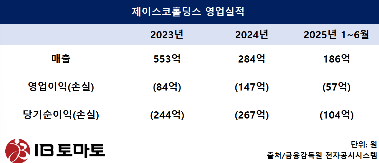 주가 부진과 함께 영업 적자도 면치 못하고 있다. 회사는 올해 상반기 매출 186억원, 영업손실 57억원을 기록했다. 회사의 순손실은 2022년 270억원, 2023년 244억원, 2024년 267억원을 기록한 끝에 올해 6월 말 기준 결손금 738억원까지 불어났다. 같은 기간 매출은 841억원→553억원→284억원으로 감소했다.
