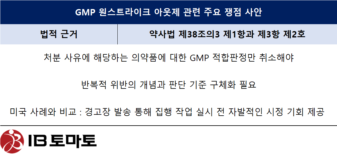 [IB토마토 이재혁 기자] GMP 원스트라이크 아웃에 불복하는 제약사들은 제도 적용 기준이 불분명하다는 입장인 것으로 파악된다. 제도의 법적 근거에 명시된 내용에 비춰봤을 때 처분 대상의 범위가 부당하고 '반복적 위반'이라는 개념이 모호하다는 것이다. 업계뿐만 아니라 정치권에서도 제도의 실효성과 형평성을 보완해야 한다는 지적이 나오는 상황에서 식품의약품안전처는 관련 연구 용역을 진행 중이며, 연구 결과를 토대로 제도 개선 방향을 논의하겠다는 방침이다.