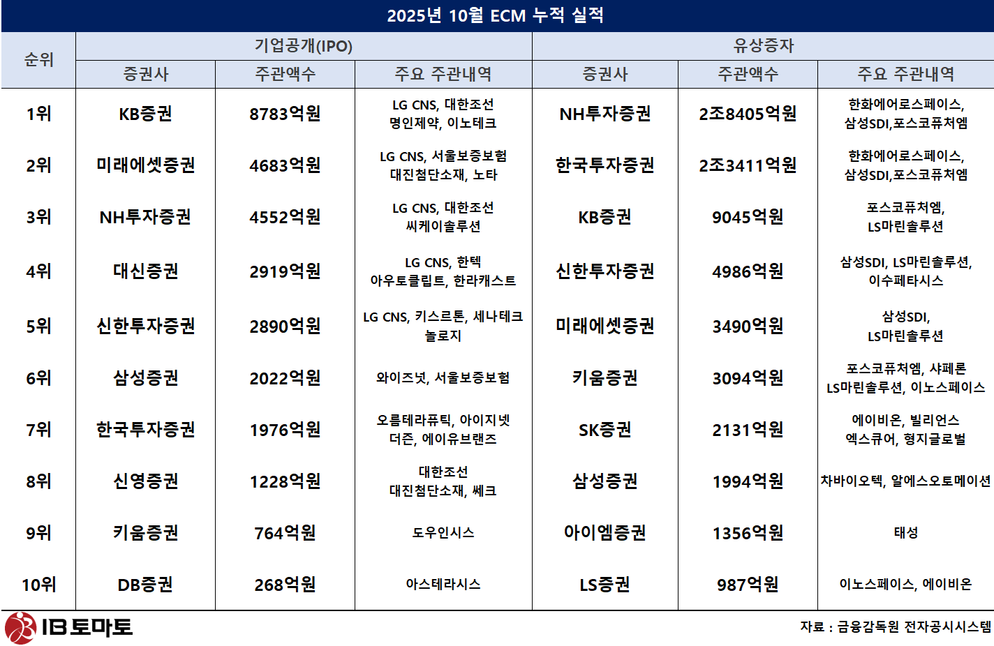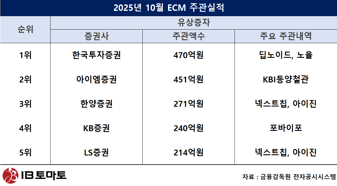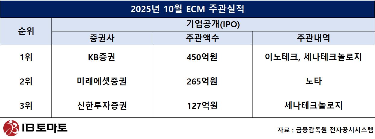 10월 ECM에서 KB증권이 기업공개(IPO) 부문 1위를 기록했다. KB증권은 복합 신뢰성 환경시험장비 제조기업 기업 이노테크, 무선통신기 전문 기업 세나테크놀로지 등의 상장을 맡으며 주관실적 450억원을 기록했다. 2위는 미래에셋증권으로 주관액수 265억원을 기록했다. 인공지능(AI) 모델 최적화 기업 노타의 상장을 맡았다. 3위는 신한투자증권으로 127억원을 주관했다. 세나테크놀로지의 상장을 맡았다.