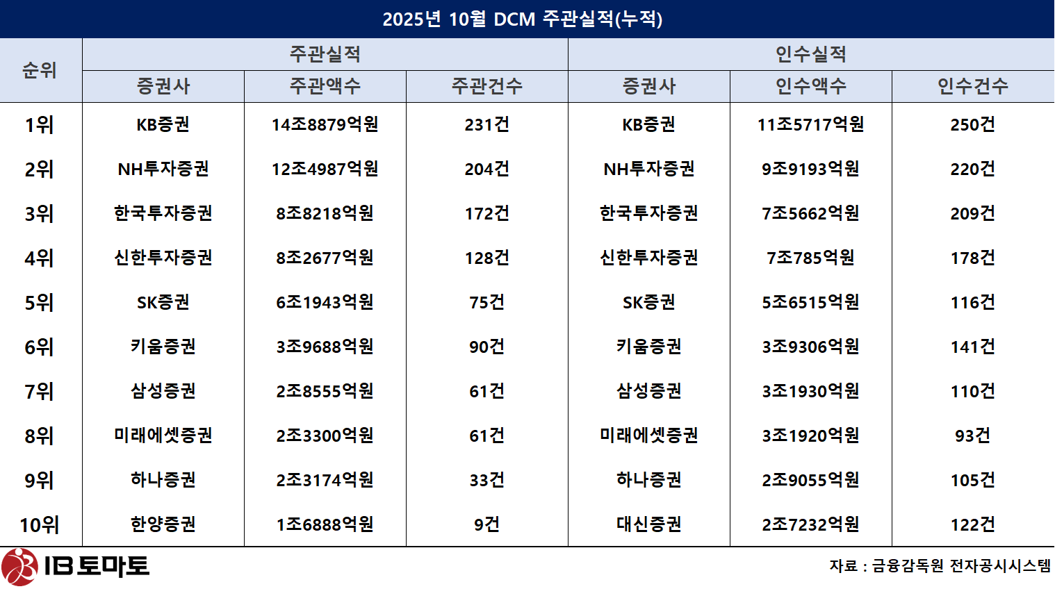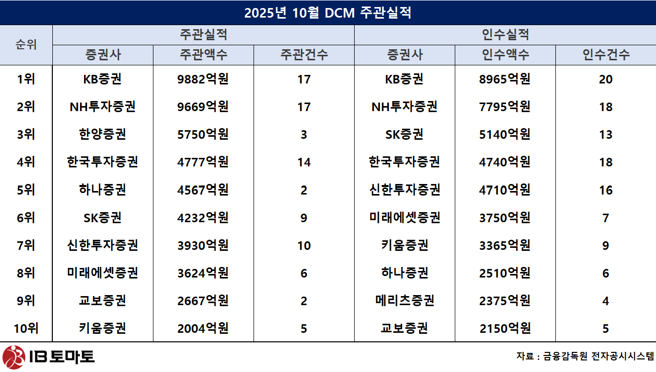 10월 DCM 인수실적 1위도 KB증권이 차지했다. KB증권의 총 인수액수는 8965억원, 인수건수는 20건이다. 2위 NH투자증권은 인수액수 7795억원, 인수건수 18건을 기록했다. 3위