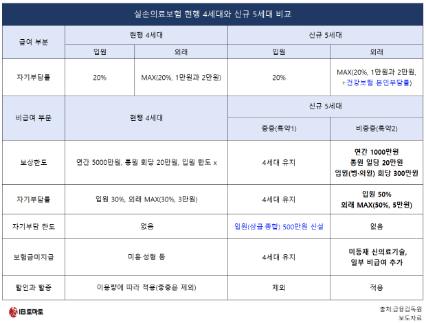 ‘비급여’ 부문은 아예 중증(특약1)과 비중증(특약2)으로 구분하고 보상한도나 자기부담 등을 차등화한다. 중증의 경우 현행 4세대 형태를 그대로 가져가는 가운데, 상급·종합병원 입원에 대한 자기부담 ‘한도’ 500만원을 신설하면서 보장을 강화했다.