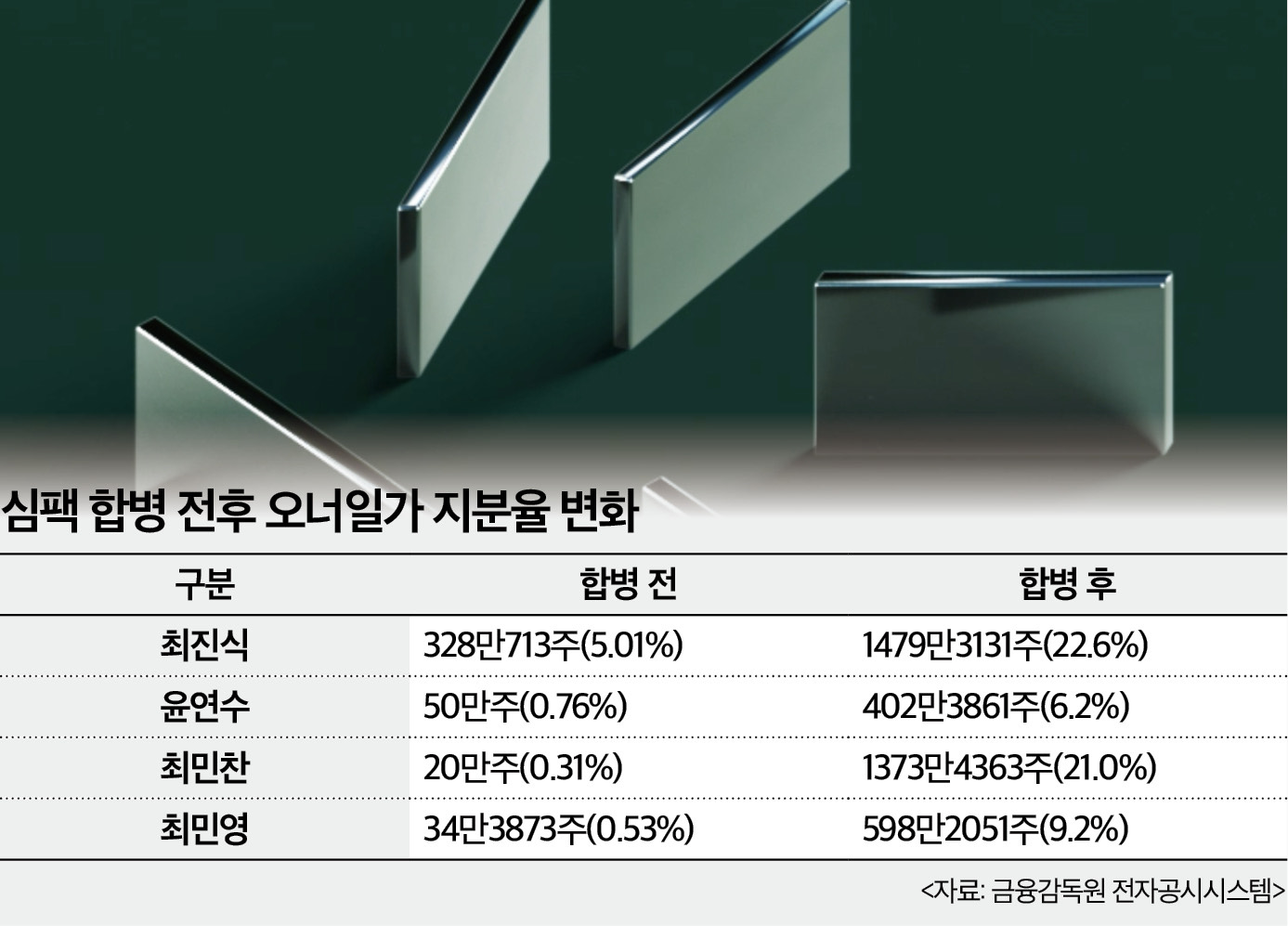 아울러 후계자로 꼽히는 최 전무의 심팩 지분율도 단번에 높아진다. 올해 상반기 기준 최 전무가 보유한 심팩 지분은 0.31%(20만주)에 불과하다. 합병으로 지분 교환이 이뤄지면 최 전무의 지분율은 21% 수준으로 높아진다. 최 회장에 이어 심팩의 2대주주로 발돋움하게 된다.