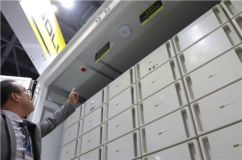 2024 세계 태양에너지 및 세계 배터리&충전 인프라 엑스포에 전시된 ESS의 센서를 가리키고 있다. (사진=연합뉴스)