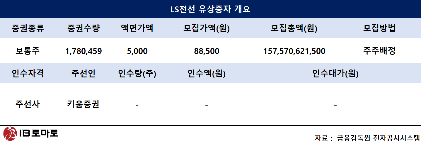 11일 금융투자업계에 따르면 LS전선은 미국 해저케이블 공장 투자재원 확충을 위한 유상증자를 추진한다. 이번 발행에서 LS전선은 주주배정을 통해 1주당 8만8500원, 총178만주를 발행해 1575억원을 조달한다는 계획이다.