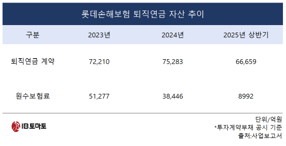 11일 보험·신용평가 업계에 따르면 롯데손해보험은 퇴직연금 적립금이 상반기 기준 약 6조6000억원이다. 보험계약부채인 책임준비금 대비 50% 수준에 달할 정도로 규모가 크다. 손해보험사 가운데 퇴직연금 민감도가 가장 높은 곳으로 꼽힌다.