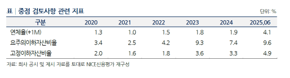 자산건전성 지표는 지난해 말 대비 저하된 상태다. 1개월 이상 연체율이 1.9%에서 4.1%까지 상승했으며, 고정이하여신비율은 3.3%에서 4.9%로 올랐다. 요주의이하여신비율도 7.4%에서 9.6%로 악화됐다.