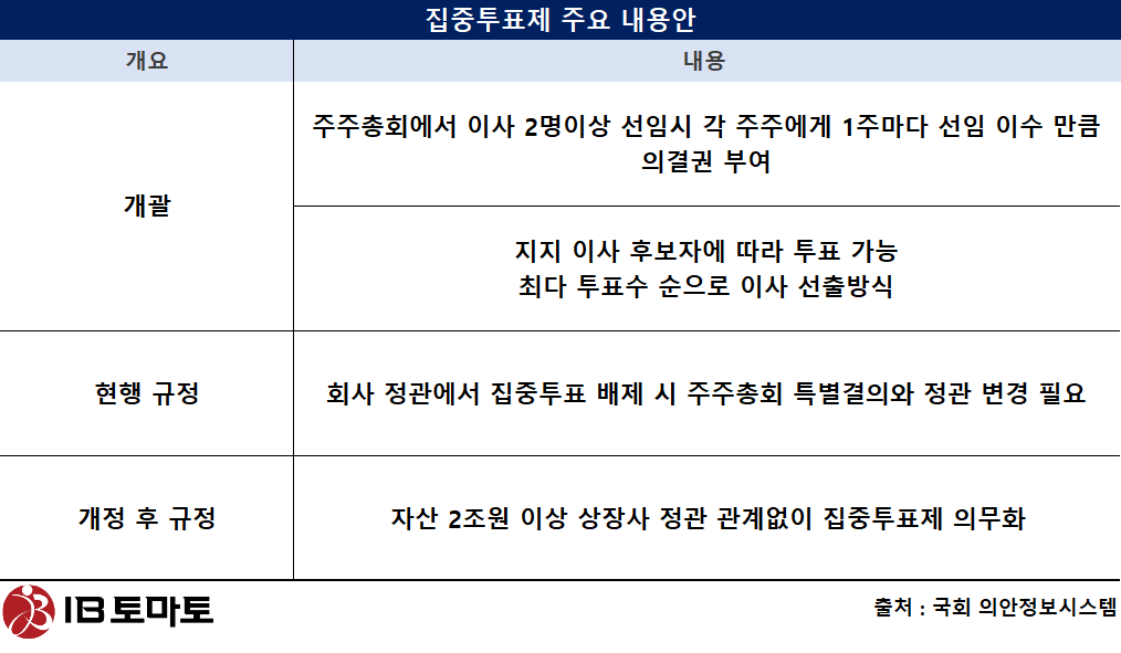 집중투표제는 두 명 이상의 이사를 선출할 때 주주가 소유한 주식수에 따라 선임할 이사의 수만큼 의결권을 부여받아 투표권을 행사하는 제도를 말한다. 제도 도입 시 주주는 1주당 선임 예정 후보자 수만큼 행사할 수 있게 된다.