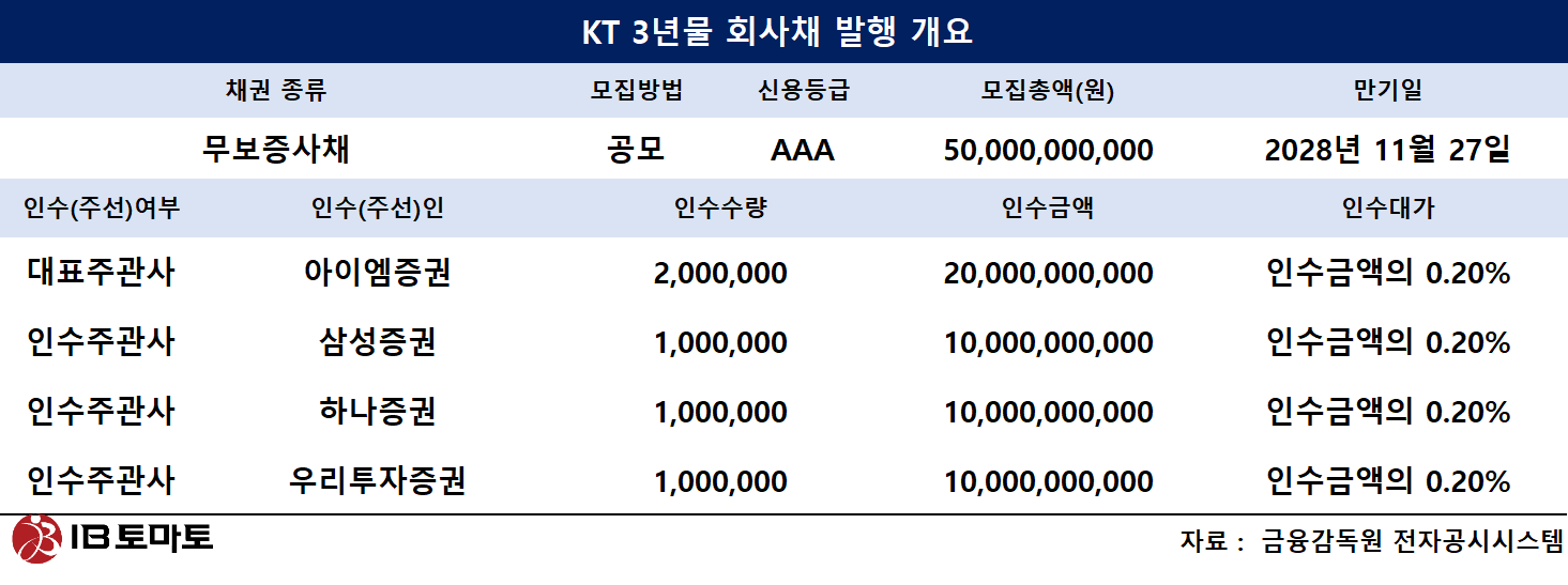 19일 금융감독원 전자공시시스템에 따르면 KT는 1500억원 규모 무기명식 이권부 공모사채 발행에 나선다. 이번 모집은 4개 트렌치로 나뉘어 3년물과 5년물, 10년물과 20년물이 발행된다. 19일 기관투자자 대산 수요예측을 진행하고 21일 발행총액을 확정한다.