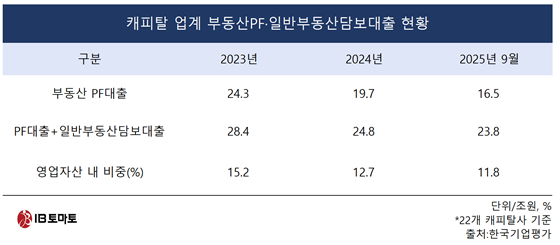 캐피탈 업계 한 관계자는 <IB토마토>에 “중소형 캐피탈사도 올해 부실채권 정리에 속도를 내면서 익스포저가 빠르게 줄어든 면이 있다”라면서 “다만 부동산 업황이 좋지 않으면 신규 부실채권 분류가 대형사 대비 늘어날 가능성이 더 높기 때문에 그만큼 건전성 개선 효과가 상쇄될 수 있다”라고 말했다.