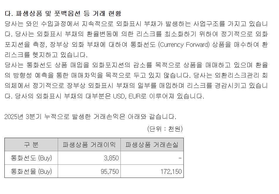 또한 최근 국내 외환시장에 고환율 기조를 띠는 점도 나라셀라에 타격을 주고 있다. 회사는 수입 와인 매출이 전체 매출의 80%를 웃돌아서다. 실제 올해 3분기 회사가 환율 방어를 위해 계약한 파생상품 중 ‘통화선물’ 거래에서는 손실 7640만원이 발생했다.
