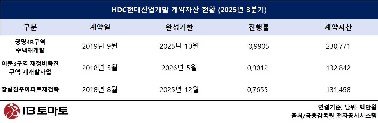 HDC현산은 올해 4분기 중 자금 유입이 본격화될 것으로 보고 있다. HDC현산 관계자는 <IB토마토>와의 통화에서 "이문아이파크자이, 광명센트럴아이파크, 잠실래미안아이파크 등 대형 정비사업에서 공정이 선행되며 계약자산(미청구공사)으로 쌓인 공사대금의 현금 회수가 지연된 영향"이라며 "이미 하반기 준공 단계에 접어들며 입주가 원활하게 진행될 것으로 예상되는데, 연말까지 현금 유입이 상당 부분 이뤄질 것으로 보인다"고 설명했다.