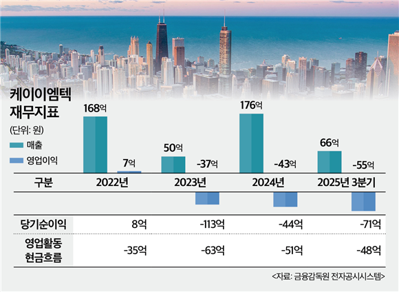 실적 회복 역시 요원하다. 케이이엠텍은 2023년 이후 수십억원 규모의 영업손실과 당기순손실을 이어가고 있다. 지난해 3분기 영업손실은 55억원, 당기순손실은 71억원에 달했다. 3분기 누적 매출은 66억원으로 전년 동기 132억원의 절반 수준으로 줄었다.