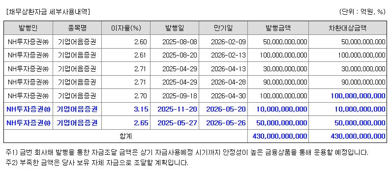 조달 자금은 전액 채무상환에 활용될 예정이다. 구체적으로는 오는 9일과 13일 만기 예정인 기업어음 1500억원, 4월과 5월 만기 물량 1700억원, 5월 말 만기 물량 1100억원 등을 상환할 예정이다. 해당 차입금의 이자율은 2.60%~3.15% 수준으로, 단기물 중심의 차입 구조가 형성돼 있다.