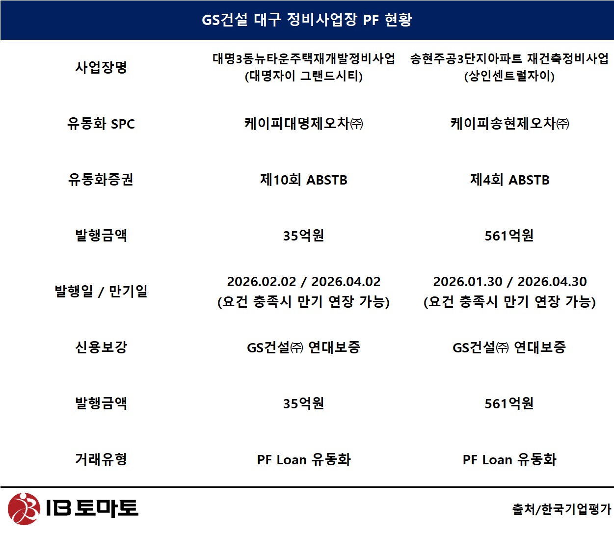 지난달 말 대명3동 뉴타운 재개발 PF는 제10회 ABSTB 35억원 규모로, 송현주공3단지 재건축 PF는 제4회 ABSTB 561억원 규모로 각각 유동화가 이뤄졌다. 두 사업 모두 PF Loan(프로젝트파이낸싱 대출) 유동화 형태로 자금을 조달했으며, GS건설이 연대보증(채무 불이행 시 시공사가 대신 갚겠다는 보증)을 제공한 구조다. 송현주공3단지의 경우 만기 연장 요건이 충족되면 2026년 4월 30일까지 기한을 늘릴 수 있도록 설계돼 있고, 대명3동 유동화증권의 만기일은 2026년 4월 2일로 설정돼 있다.