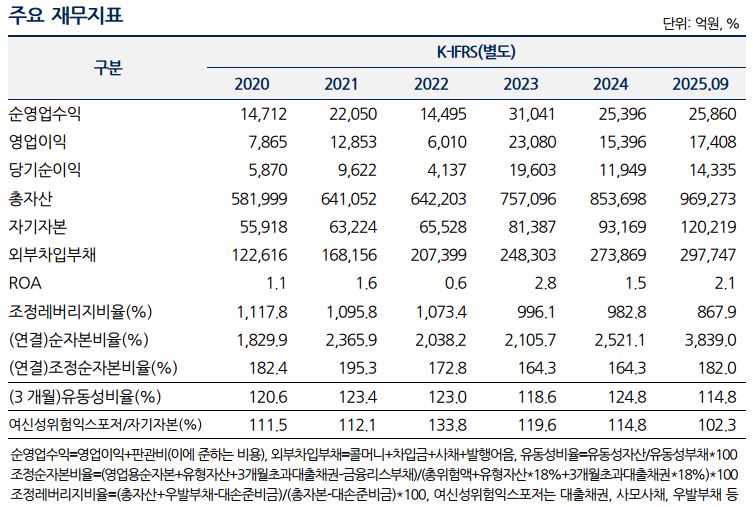이에 따라 순영업수익은 2022년 1조4495억원에서 2023년 3조1041억원으로 크게 늘었고, 2024년에도 2조5396억원을 유지했다. 2025년 1~9월 기준 순영업수익은 2조5860억원으로 전년 동기(2조516억원)를 상회했다. 영업이익은 같은 기간 6100억원에서 2조3080억원으로 확대된 뒤, 2025년 1~9월에는 1조7408억원을 기록했다. 순이익 역시 2022년 4137억원에서 2025년 1~9월 1조4335억원으로 개선됐다.