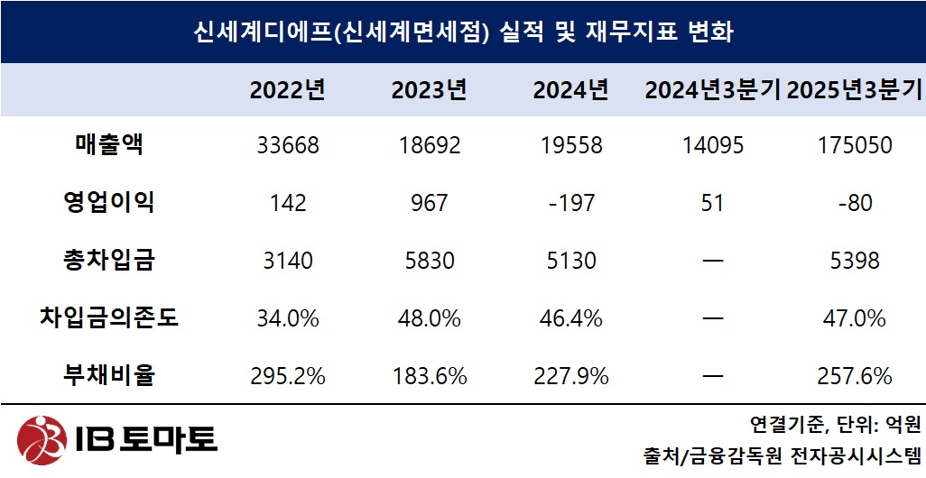지난해 연간 실적은 아직 발표되지 않았지만 신세계(004170) 3분기 보고서 중 종속기업의 재무정보를 살펴보면, 신세계면세점의 매출액은 1조 7050억원으로 직전년도 동기(1조 4095억원) 대비 20.96% 증가했다. 영업이익은 51억원 흑자에서 80억원 손실로 적자전환해 수익성 개선이 절실한 상황이다. 특히 부채(8266억원)에서 자본(3209억원)을 나눈 지표인 부채비율은 257.6%로 2024년 말 227.9% 대비 부담이 늘었다.