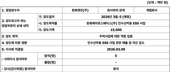 10일 금융감독원 전자공시시스템에 따르면 한화에어로는 그룹 특수관계사인 한화엔진에 민수선박용 ESS 사업을 양도한다. 양도가액은 155억원으로 책정됐으며, 오는 3월 중 사업 양도가 이뤄질 예정이다. 한화에어로 이사회는 지난 9일 사업을 양도하기로 의결했다.