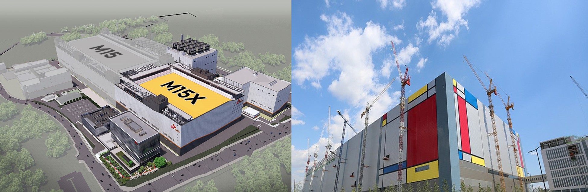 SK하이닉스의 청주 M15X 조감도(왼쪽)와 삼성전자의 평택캠퍼스 반도체 생산라인(출저=각 사)