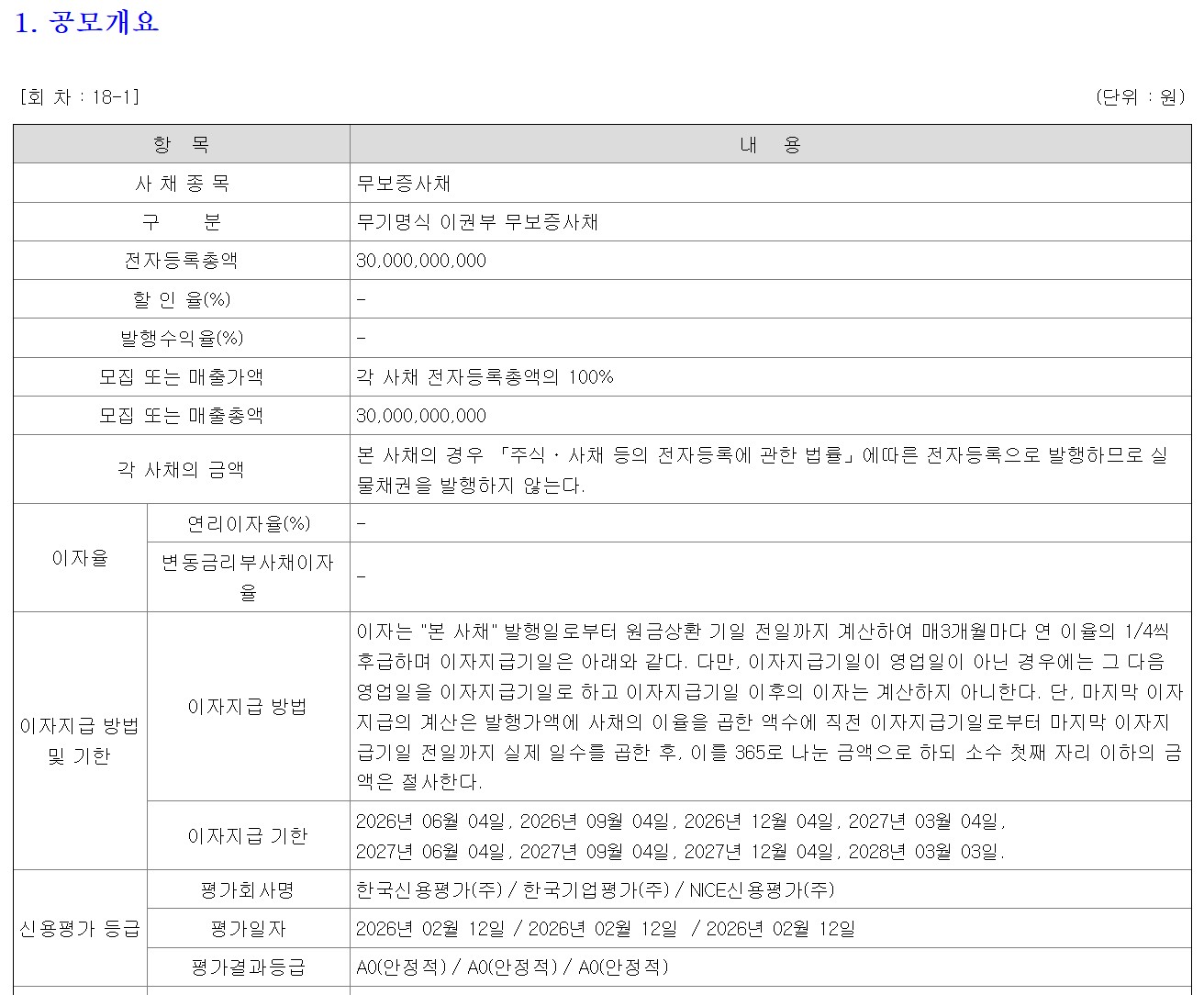 두 회차 모두 전자등록 방식으로 발행되며, 납입일은 2026년 3월4일이다. 이자는 발행일 이후 매 3개월마다 분기 후급 방식으로 지급되고, 원금은 만기 일시상환된다. 만기는 2년물이 2028년 3월3일, 3년물이 2029년 3월2일이다.