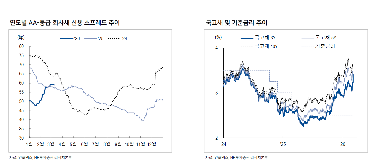 실제로 지난 1월 한국은행 금융통화위원회(금통위) 이후 국고채 금리가 상승하면서 크레딧 채권의 신용 스프레드도 확대됐다. 기준금리 인하 사이클 종료 확인과 함께 방향 전환 가능성에 대한 경계감이 반영됐기 때문이다. 이는 연초효과에 따른 스프레드 축소를 상쇄하는 방향으로 영향을 미쳤다.