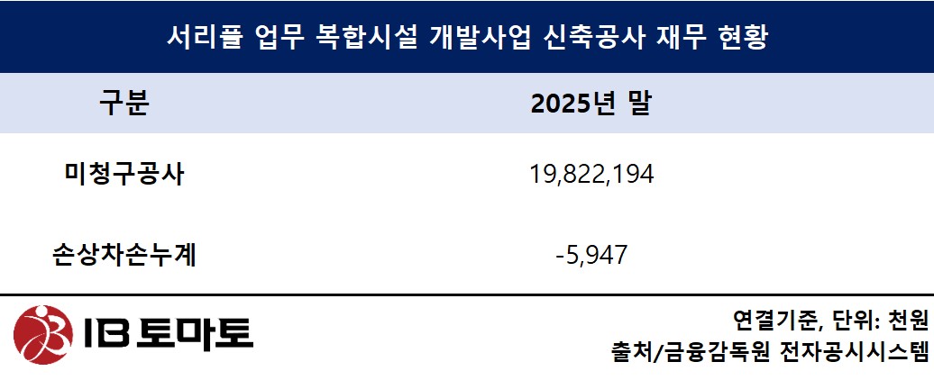 3일 금융감독원 전자공시시스템에 따르면 지난해 기준 사업보고서에 나온 서리풀 업무 복합시설 개발사업 신축공사에 대한 공사 진행률은 1.82%로 나타났다. 해당 사업에 대한 미청구공사 규모는 약 198억원 수준으로 집계됐으며, 손상차손 누계는 약 600만원 수준에 그쳤다.