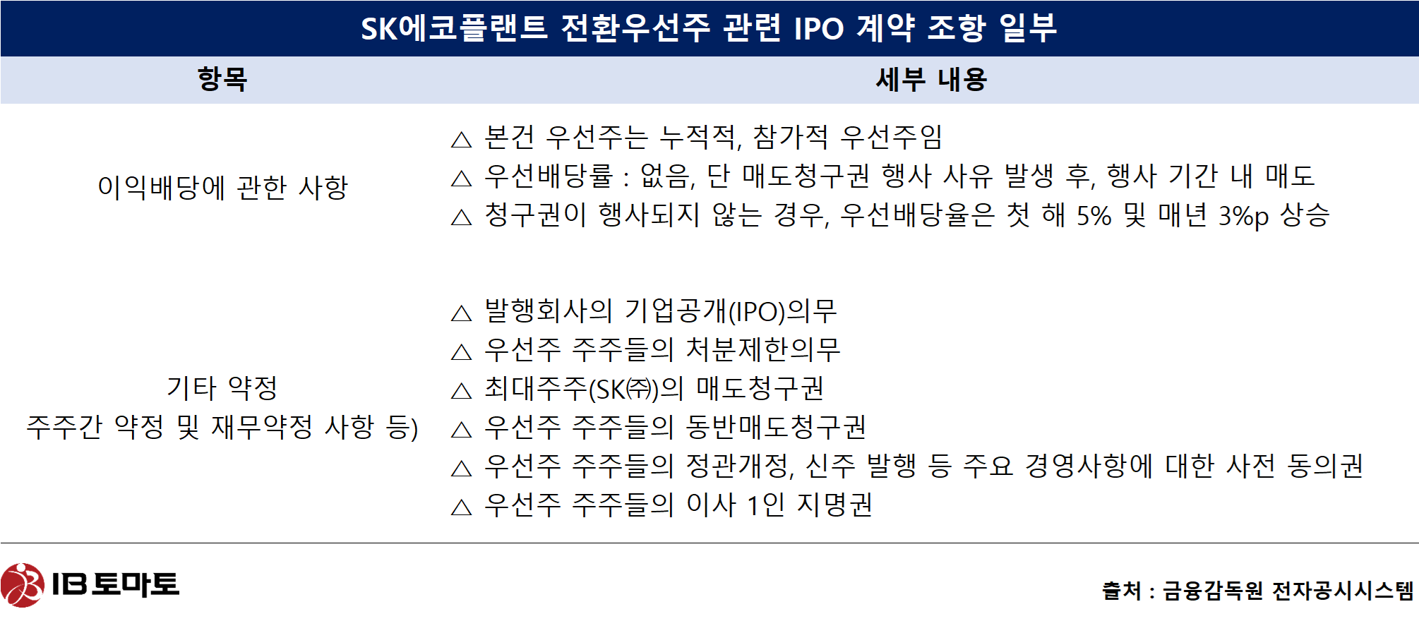IB업계 한 관계자는 <IB토마토>에 "현재 7월 CPS 기한 만료에 따른 지분 매입 방식을 두고 SK에코플랜트와 FI들이 적정 수준에서 협의를 진행 중"이라며 "중복상장 규제 강화로 IPO 기한을 맞추기는 쉽지 않은 상황"이라고 말했다.