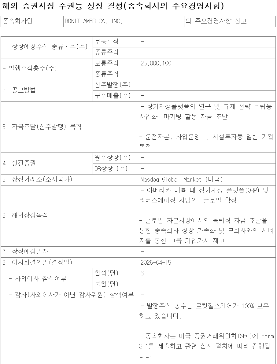 로킷헬스케어 측은 "아메리카 대륙 내 장기재생 플랫폼(ORP)과 리버스에이징 사업의 글로벌 확장, 글로벌 자본시장에서의 독립적 자금 조달을 통한 종속회사 성장 가속화 및 모회사와의 시너지를 통한 그룹 기업가치 제고를 위해 글로벌 상장을 결정했다"고 밝혔다.